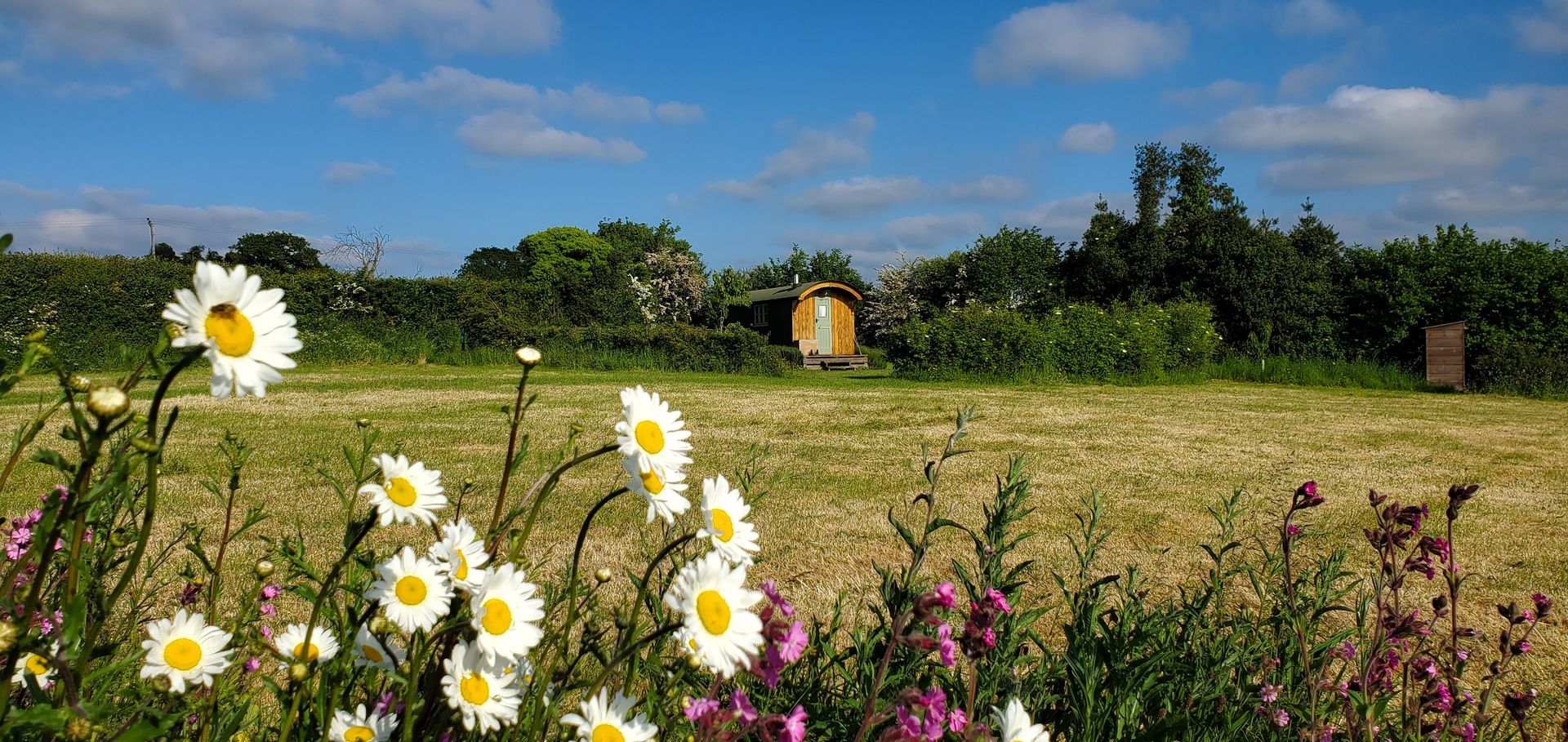 It is situated in a cosy corner of the field and has excellent country views. Each hut has a spotless compost loo, 25m from your door and good showers are 150m away. Outside is a fire pit with logs available for £10. Wood for the log burner inside is free.